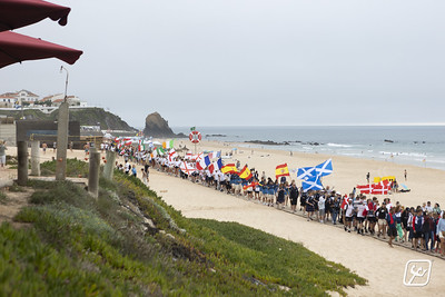 A meio da tarde, as atenções voltaram-se para a cerimónia de abertura do evento, que decorreu junto à Aldeia Neptuno. A cerimónia contou com o desfile das 17 seleções que integram o Santa Cruz Eurosurf Junior 2024, da aldeia até ao areal, ao ritmo contagiante do grupo de percussão, Combe Capelle. Durante a cerimónia, houve o hastear das bandeiras dos países participantes, que subiram ao palco do festival para juntar a areia que simbolicamente trouxeram da sua terra natal.